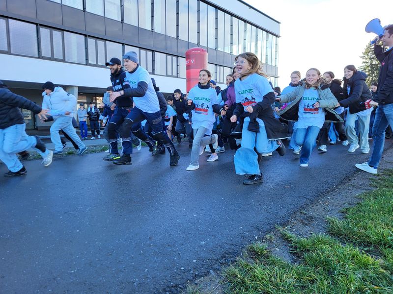 Nach einer kurzen Ansprache gings los: ab durch den Start beim Stadion Schnabelholz, Richtung Rhein und zum Parkplatz der Firma Gunz, die den Lauf mitsponsort. Zur Belohnung gab es noch eine Stärkung, bevor der Rückweg in den Schulalltag angetreten wurde.